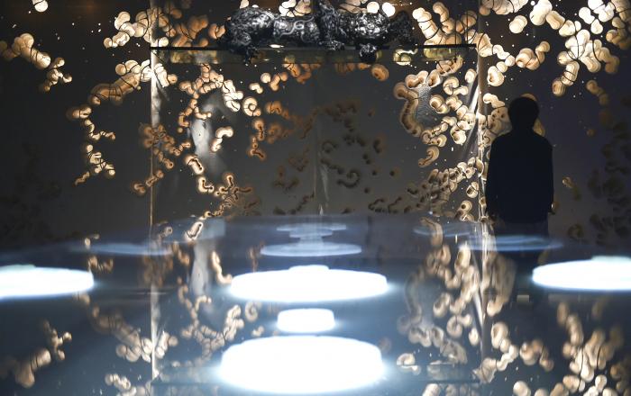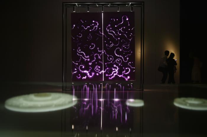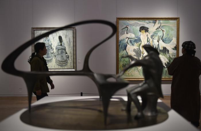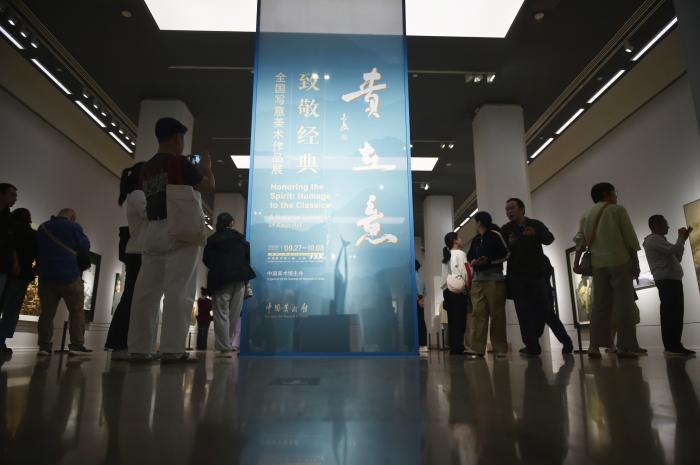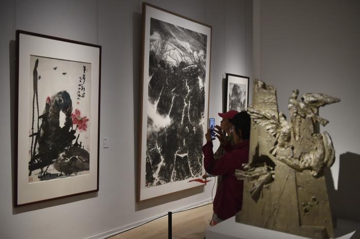 本次展览以贯穿中国艺术史的写意精神为坐标,汇集了中国美术馆馆藏、特邀创作以及从全国范围内征集的美术作品近600件,包含中国画、油画、版画、雕塑、装置、新媒体等艺术门类。9月27日,观众在中国美术馆参观展出作品。