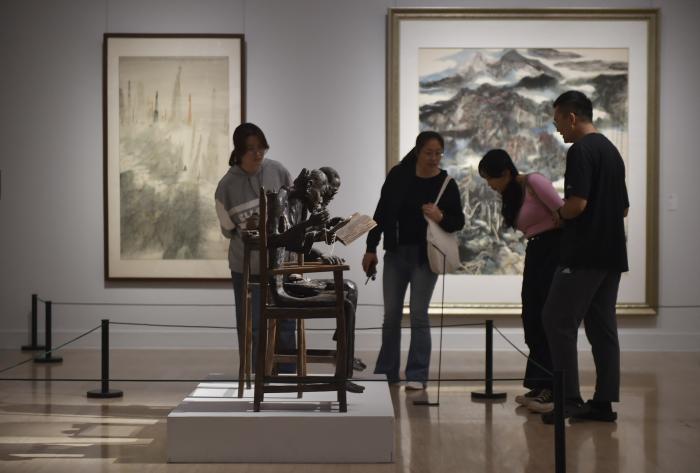 9月27日,观众在中国美术馆参观雕塑作品《苦旅共甘泉》。
