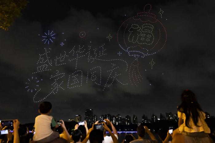 1000架无人机在世纪公园镜天湖上空组成“国庆快乐”“盛世华诞 家国同庆”“浦东欢迎您”等字样和玉兰、荷花、梅花等花卉图案,在国庆假期即将到来之际,为市民游客献上一场视觉盛宴。9月27日,市民游客在上海世纪公园观看无人机灯光秀。
