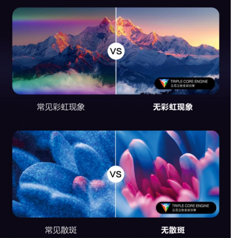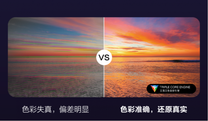 在画质表现上,“三芯三色全彩引擎”技术实现了显著的色彩突破。得益于三色光源直输架构,投影画面呈现出更广的色域范围,色彩还原精准度也得到全面提升:白色如初雪般纯净,清晰通透;彩色则如同落日霞光洒满天际,绚丽而纯正。结合10bit色深所带来的10.7亿+种色彩呈现能力,细致还原自然界丰富的光影细节和真实质感。