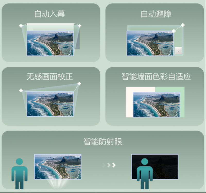 EF-50搭载智能科技,拥有超强 ToF sensor全自动画面调节功能,具备自动入幕、自动避障、无感画面校正、智能墙面色彩自适应和智能防射眼功能,开机即可呈现理想画面。与腾讯联合打造双桌面UI系统,支持一键切换电影、音乐、氛围和日常四大自然情境空间,让操作如自然流转般轻松顺畅。