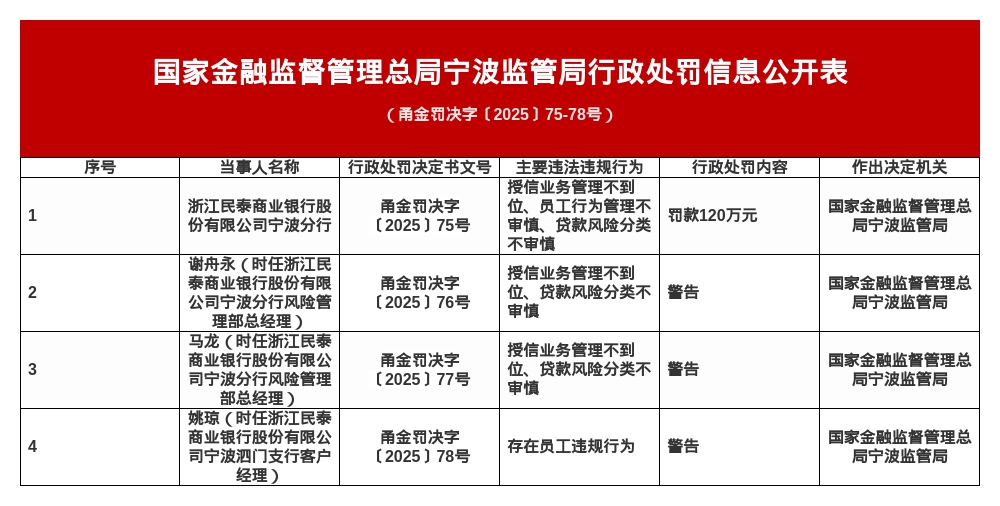 国家金融监督管理总局宁波监管局发布了一张罚单,剑指浙江民泰商业银行股份有限公司宁波分行及其相关责任人。