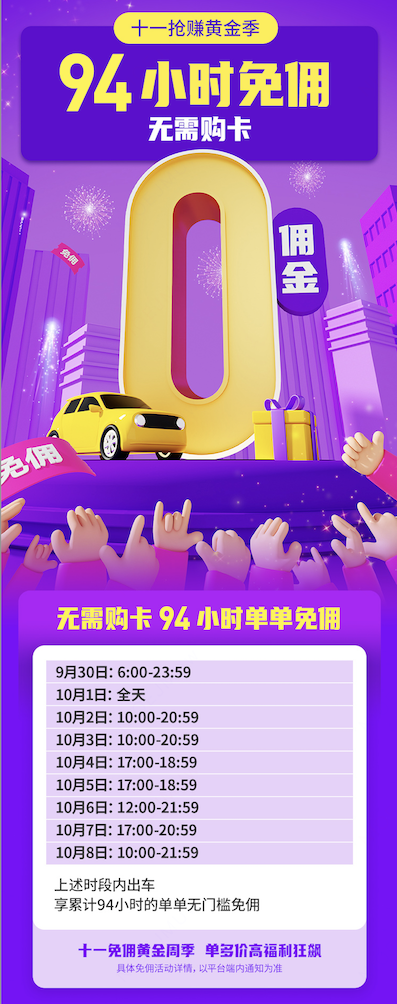 9月30日至10月8日期间,花小猪推出“十一抢赚黄金季”活动,在全国百城推出最高94小时免佣活动,司机师傅们无需购卡,出车即享免佣,覆盖节前归乡出游和节后返程的全部高峰时段。部分城市司机还可在特定时段享受每单2元-5元的节假日服务费和高峰期飞涨奖励。