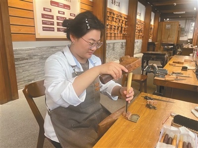 在相邻的另一张工作台上,一个戴黑框眼镜的年轻女孩正拿着一枚蝙蝠纹角牙与桌子上摆放的原件认真对比,然后在师父的指点下,拿起刻刀小心翼翼地剔掉多余的木屑。她就是颐和园家具修复第四代传承人——90后李纪洁。李纪洁2020年加入家具修复班,成为团队里学历最高的女木匠,在师父王新杰的带领下,与师兄师姐们一起守护颐和园的百年文脉。