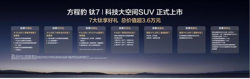 在购车权益上,方程豹更是诚意十足,新车共推出4个配置版本,售价17.98万元-21.98万元,款款越级,款款超值,下单即刻享受最高价值超3.6万元的上市权益,让每一个家庭都能轻松拥抱钛7,让美好生活触手可及。