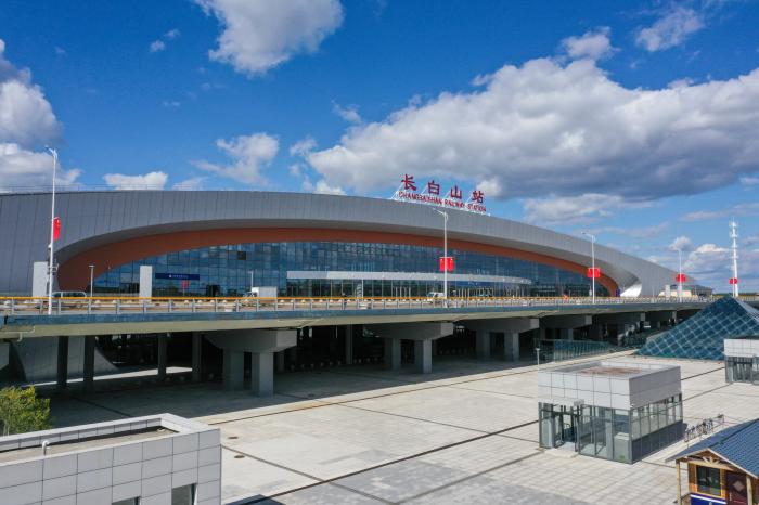 北京朝阳、沈阳北至长白山站最快分别4小时33分钟、1小时53分钟可达,旅时大大缩短,长白山接入北京“半日经济圈”。9月26日拍摄的长白山站(无人机照片)。
