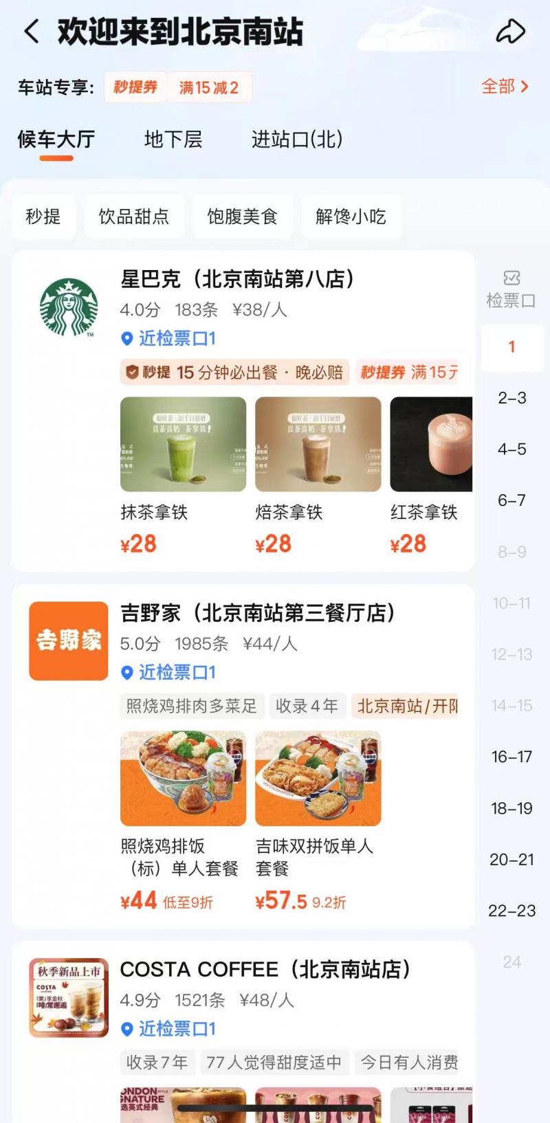 北青报记者打开美团App定位到北京南站看到,消费者可在候车大厅、检票口、地下层、进出站口查找餐饮店,目前已有麦当劳、星巴克、汉堡王的门店在线上页面提示“秒提”服务。今年国庆假期,该指引功能已率先覆盖30个核心铁路枢纽,涉及北京、上海、广州、深圳、西安、杭州、重庆、成都、长沙、武汉、郑州等重点旅游城市。