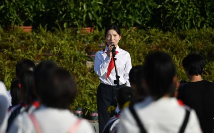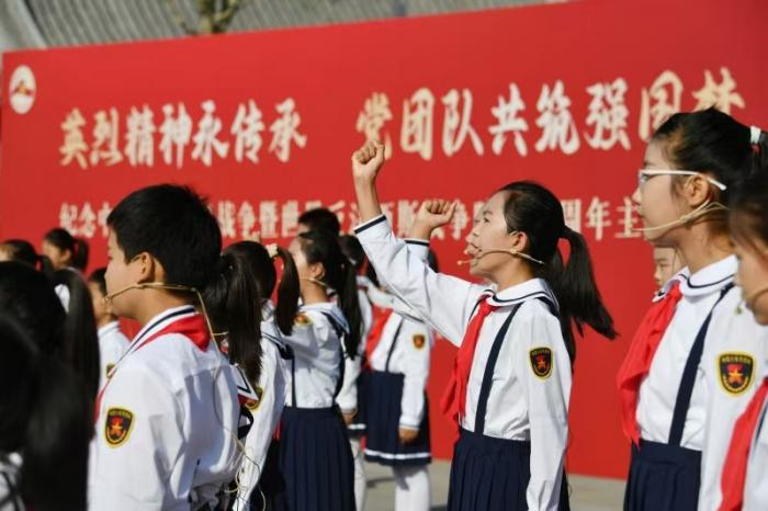 随后,师生代表集体宣誓,党员教师、团员教师和全体少先队员共同举起右拳,发出铿锵誓言:“继承先烈遗志,传承红色基因…… 请党放心,强国有我!”。