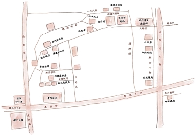 从韩家胡同东口出,左拐,继续沿陕西巷前行。在您右手一侧,有小凤仙所在的“云吉班”,与她经常出入的“上林仙馆”。在这两处馆舍之间的榆树巷1号,曾是赛金花的寓所与班子。