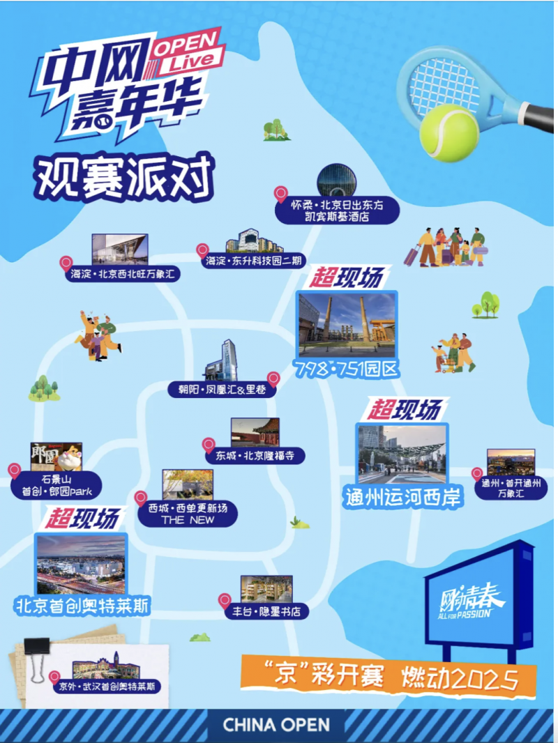 此外,从隆福寺到西单更新场,从西北旺万象汇到隐墨书店,9个特色观赛点遍布京城,形成全覆盖的观赛网络。武汉首创奥特莱斯也首次加入,将网球热情延伸至京外。