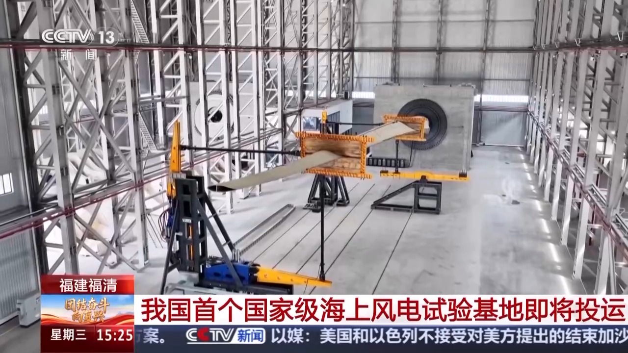 总台记者黄珊:海上风电试验基地包括陆上检测中心和试验风电场两部分,陆上检测中心坐落于福清市的江阴产业园内,靠近江阴港码头,旁边是福建最大的风电产业园。整个陆上检测中心包含了叶片试验平台和传动链测试平台。