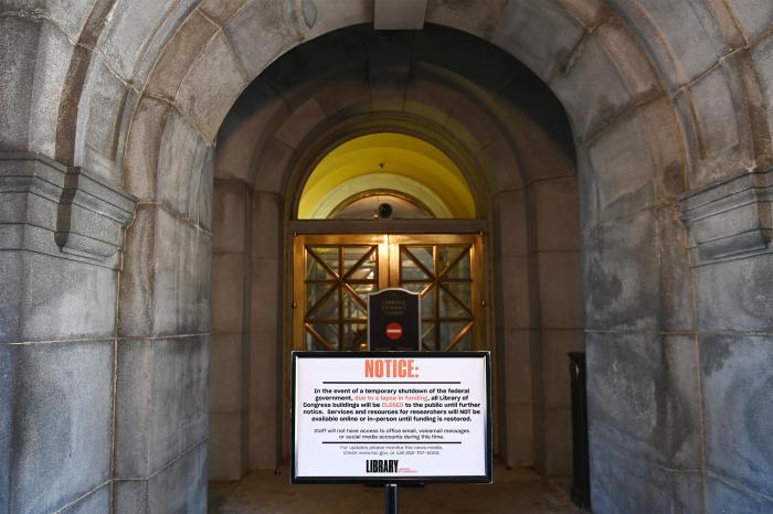 10月1日,在美国华盛顿的国会图书馆外,公告牌显示国会图书馆因美国联邦政府“停摆”而关闭。新华社记者 李睿 摄