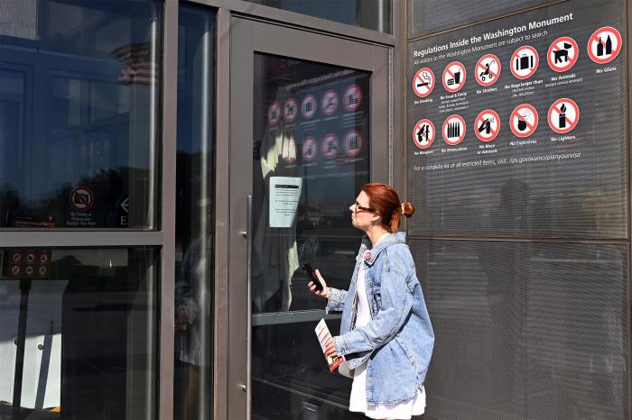 10月1日,在美国华盛顿的华盛顿纪念碑游客中心,一名女子在了解公告信息,公告显示华盛顿纪念碑因美国联邦政府“停摆”而关闭。新华社记者 李睿 摄