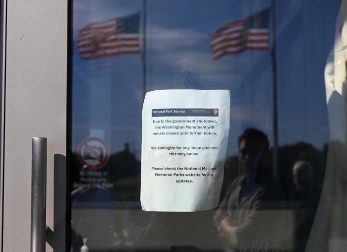 10月1日,在美国华盛顿的华盛顿纪念碑游客中心,公告显示华盛顿纪念碑因美国联邦政府“停摆”而关闭。新华社记者 李睿 摄