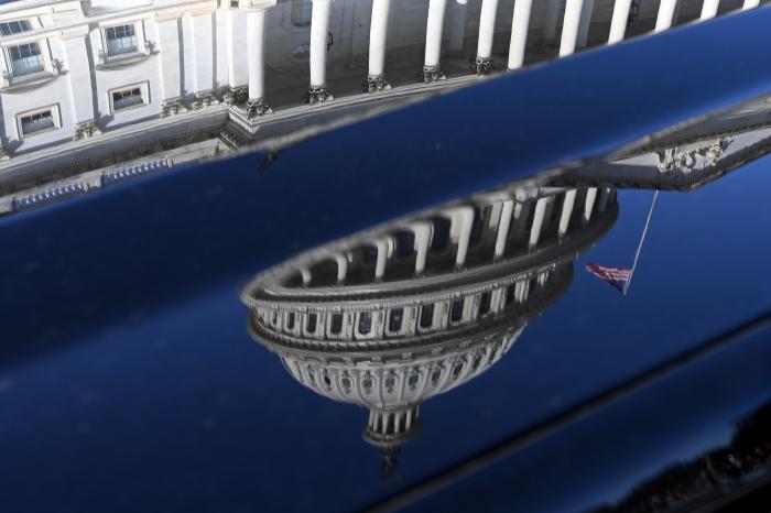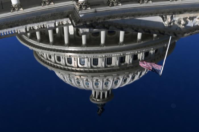 这是10月1日在美国首都华盛顿拍摄的美国国会大厦倒影。新华社记者 李睿 摄