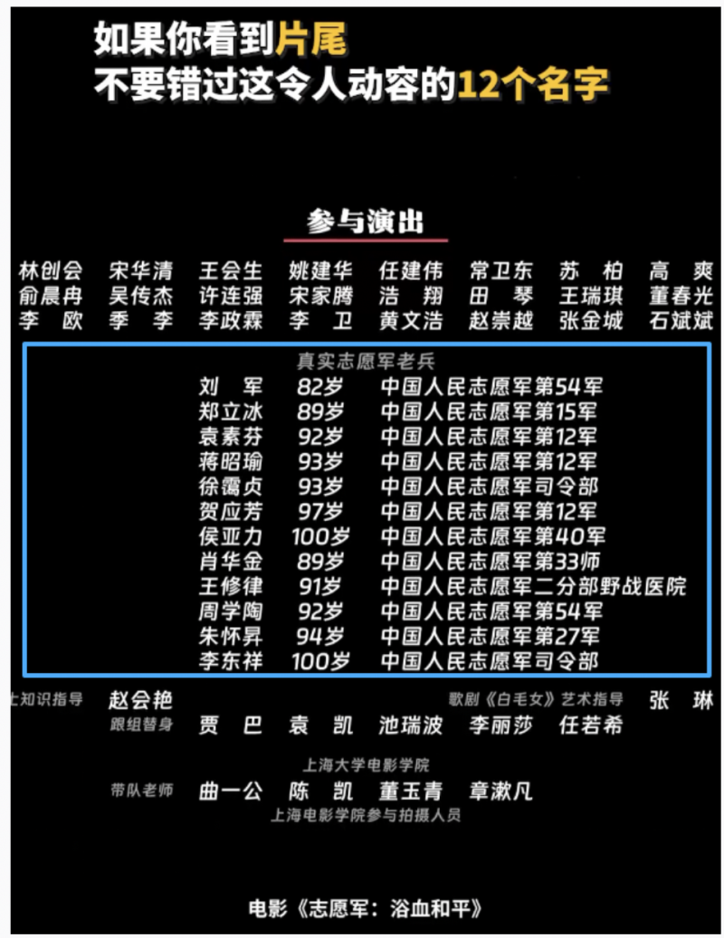 电影的片尾有一个细节很用心,也很打动人,就是银幕上出现了12位志愿军老兵的名字。他们参与了当年的战争,也参加了电影的拍摄。可以说他们是历史与今天、电影与现实之间的桥梁,向最可爱的人致敬。网友说,影院内,我们透过光影铭记历史。(详情>>)