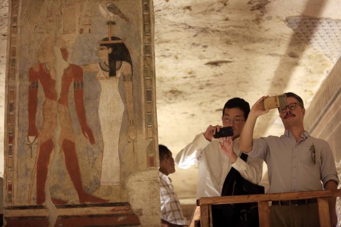10月4日,游客在埃及卢克索帝王谷的阿蒙霍特普三世法老墓内拍照。