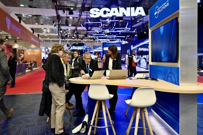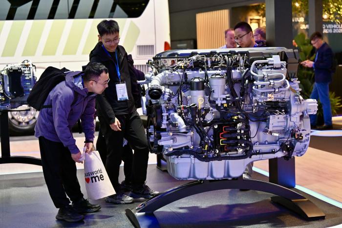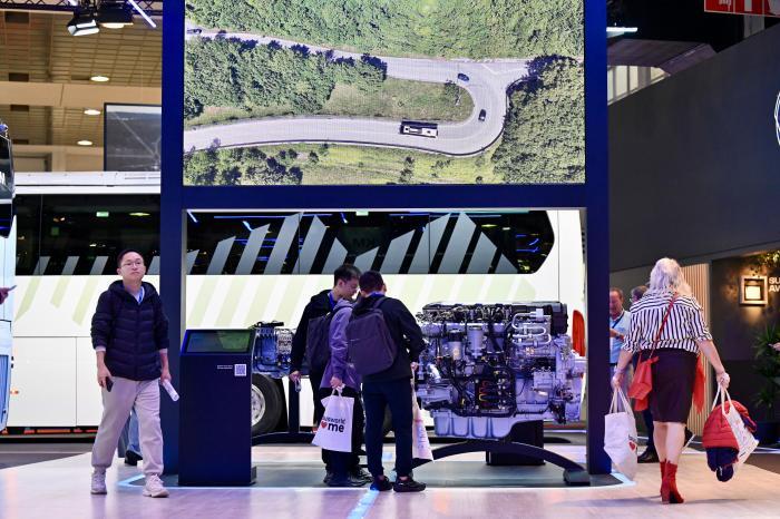 10月4日,在比利时布鲁塞尔举行的世界客车博览会上,参观者在斯堪尼亚展台观看一款核心装置展品。