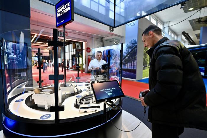 10月4日,在比利时布鲁塞尔举行的世界客车博览会上,参观者通过交互式模型体验公交系统解决方案。