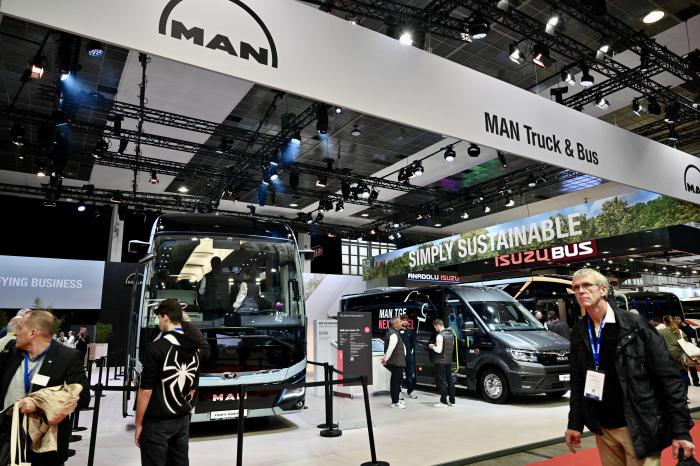 10月4日,在比利时布鲁塞尔举行的世界客车博览会上,参观者经过曼恩展台。
