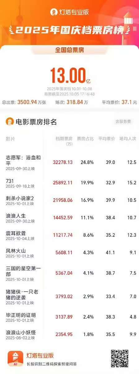 根据灯塔专业版数据,截至10月5日17时16分,2025年国庆档票房(含预售)突破13亿元。《志愿军:浴血和平》《731》《刺杀小说家2》《浪浪人生》《震耳欲聋》暂列票房前五名,且各片档期票房均突破1亿元。