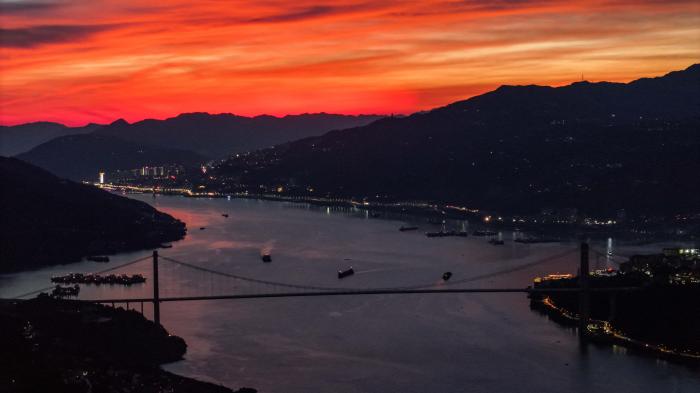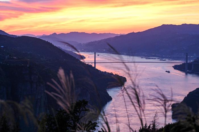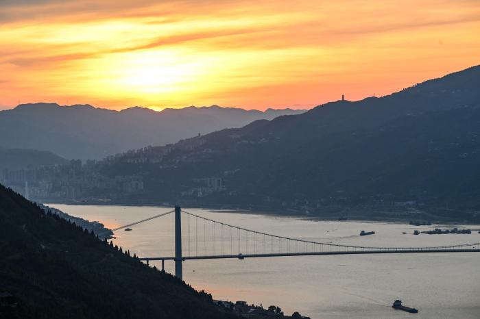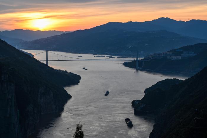 10月5日,在长江三峡瞿塘峡峡口附近,夕阳映红天空和江面。