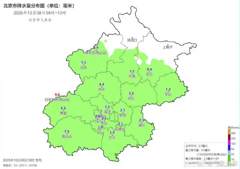 目前本市降雨较为平缓,延庆、怀柔、密云、平谷、昌平、海淀、顺义地区相对明显;8日4时至10时,全市平均降水量2.8毫米,城区平均3.0毫米,最大降水量出现在门头沟白羊石虎(高山站)9.6毫米。 预计未来2小时降雨持续,雨势平缓。