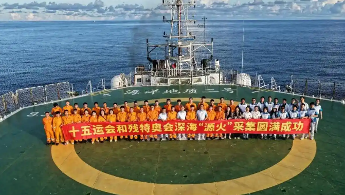 9月16日,“海洋地质二号”科考船出发前往南海北部海域开展科考航次并执行深海“源火”采集任务。9月18日,抵达作业区,“海马”号集成“源火”采集装置下潜至水深1522米的“海马冷泉区”渗漏点。科研人员远程精准操控机械臂持采集舱,采集冷泉口溢出的可燃冰及伴生气。采集到足量可燃冰后,降压使其分解,产生的甲烷气体即为“源火”气源。随后,科考船甲板面的光伏发电装置将太阳能转化为电能并传输到海底,引燃气源获取“源火”,成功实现深海可燃冰安全引燃与“源火”回收。海洋科技赋能,让十五运会和残特奥会的火种采集,上演了史无前例的深海冰火交融、体育与科技双向奔赴的视觉盛宴。