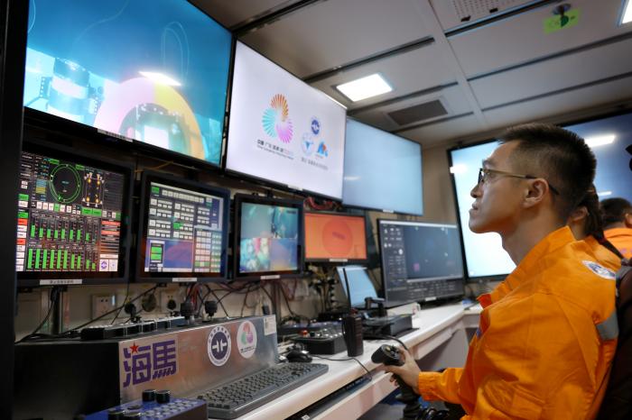 随后,科考船甲板面的太阳能光伏装置发电并传输到海底,引燃气源获取“源火”。在科考船上的“海马”号深海遥控潜水器控制室里,工作人员遥控采火装置在海底进行作业(9月18日摄)。新华社记者 卢汉欣 摄