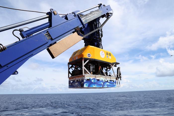 “海马”号深海遥控潜水器搭载着采火装置准备下水采集“源火”(9月18日摄)。新华社记者 卢汉欣 摄