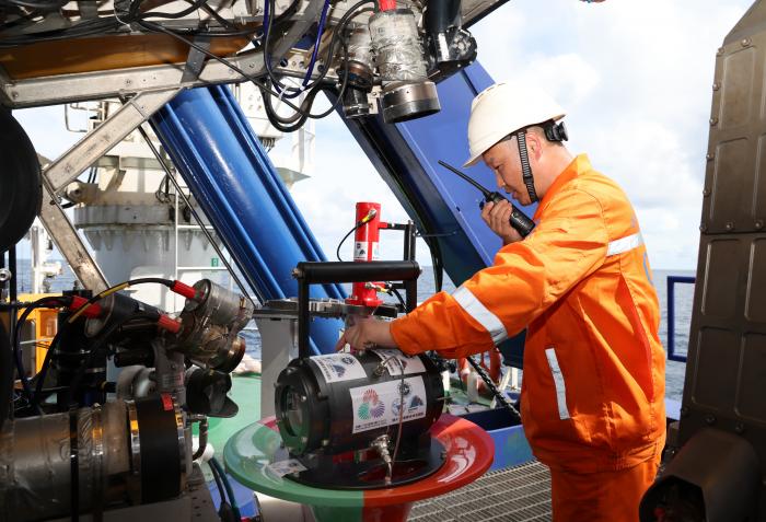 在科考船甲板面,工作人员从搭载在“海马”号深海遥控潜水器上的采火装置里取火(9月18日摄)。新华社记者 卢汉欣 摄