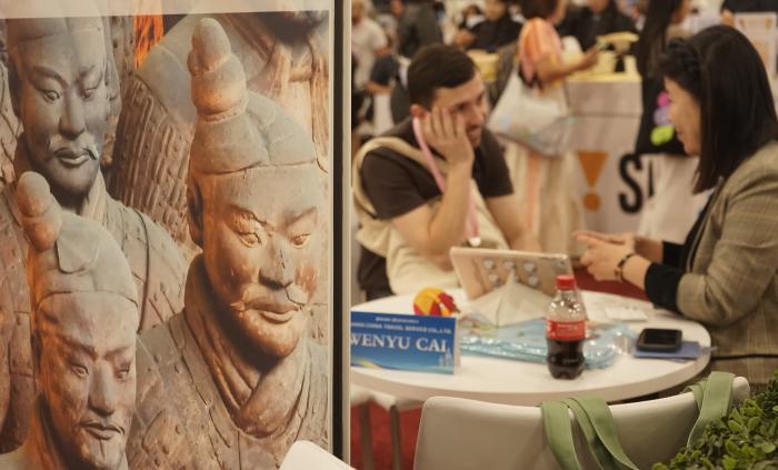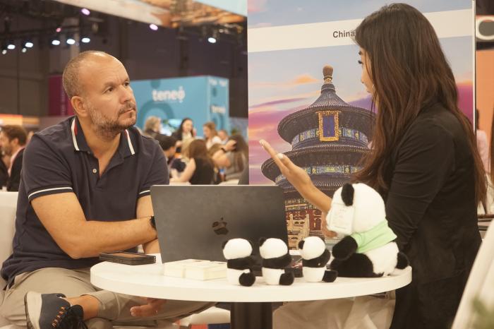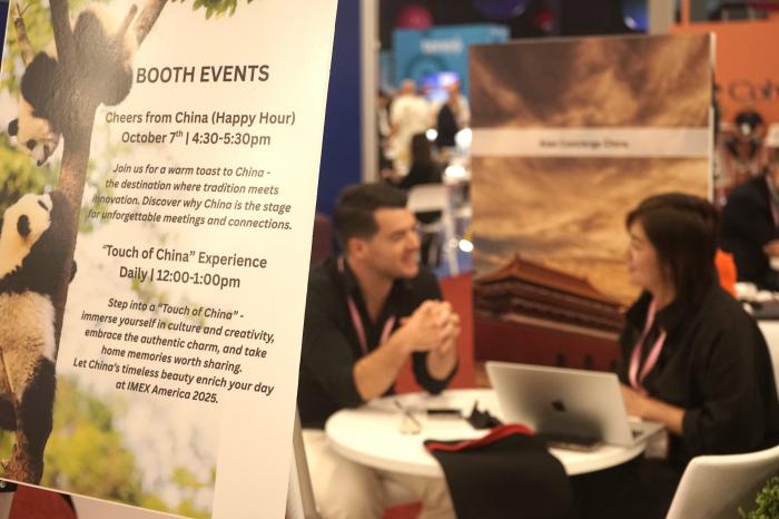 中国多地文化和旅游部门及旅游企业集体亮相,展示中国最新旅游资源和发展成果,吸引大量客商前来洽谈。10月8日,在美国拉斯维加斯,人们在2025年美国国际会议与奖励旅游展的中国展区交谈。
