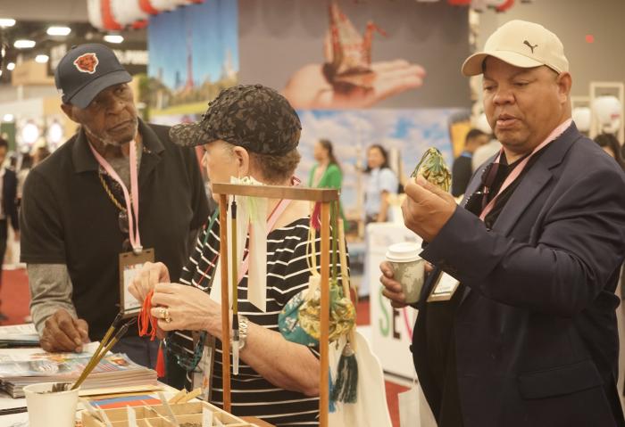 10月8日,在美国拉斯维加斯,人们在2025年美国国际会议与奖励旅游展的中国展区参观。