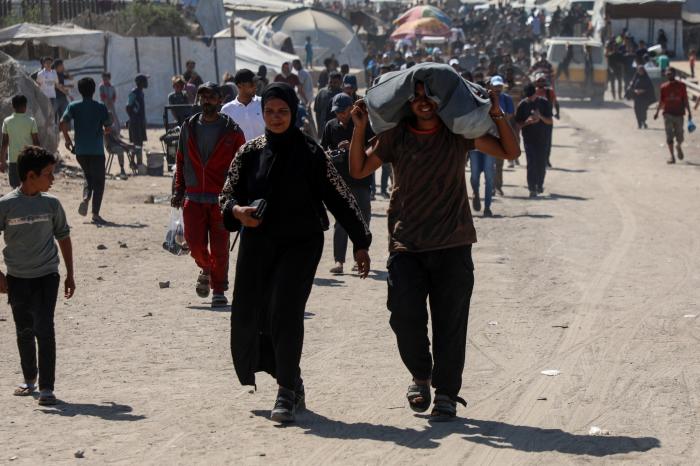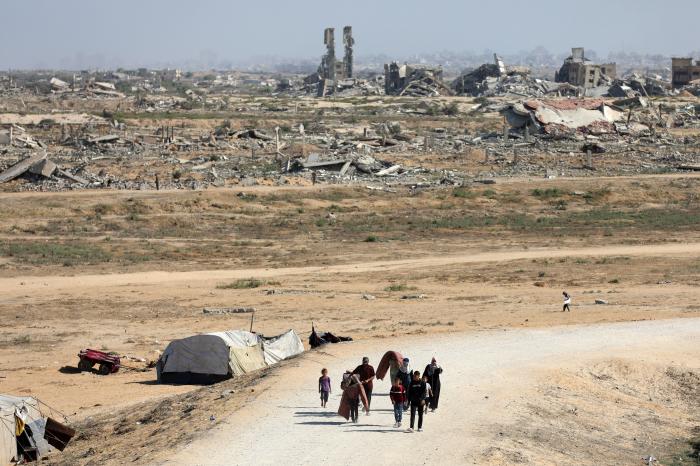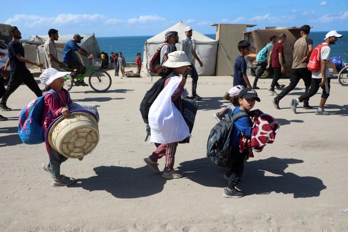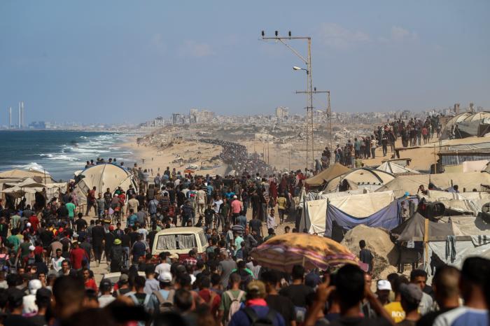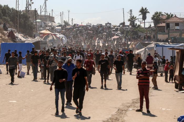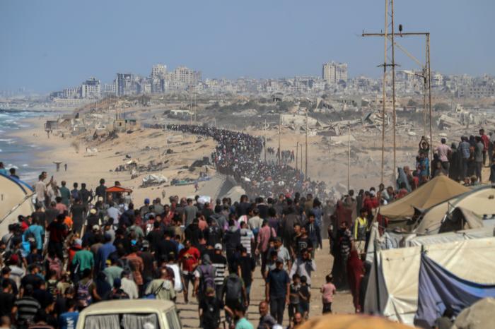 10月10日,在加沙地带中部,大批逃离家园的巴勒斯坦民众走在返回加沙城的路上。