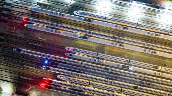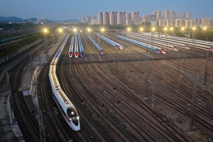 10月10日拍摄的停靠在南京动车段南京南动车运用所存车线上的列车(无人机照片)。新华社发(杨素平摄)
