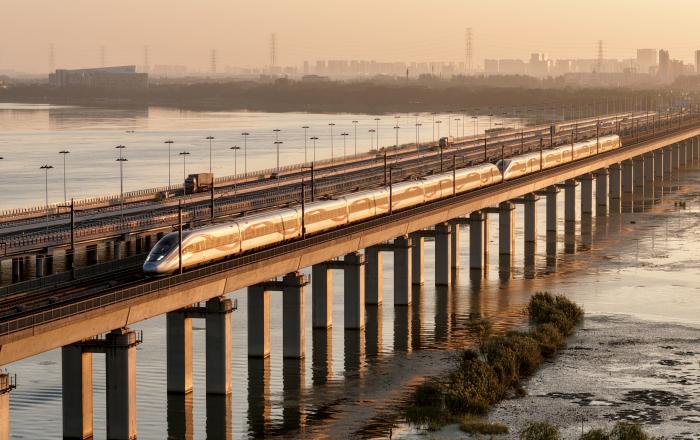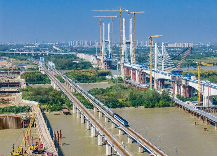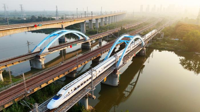 10月10日在江苏南京拍摄的行驶中的动车组列车(无人机照片)。新华社发(苏阳摄)
