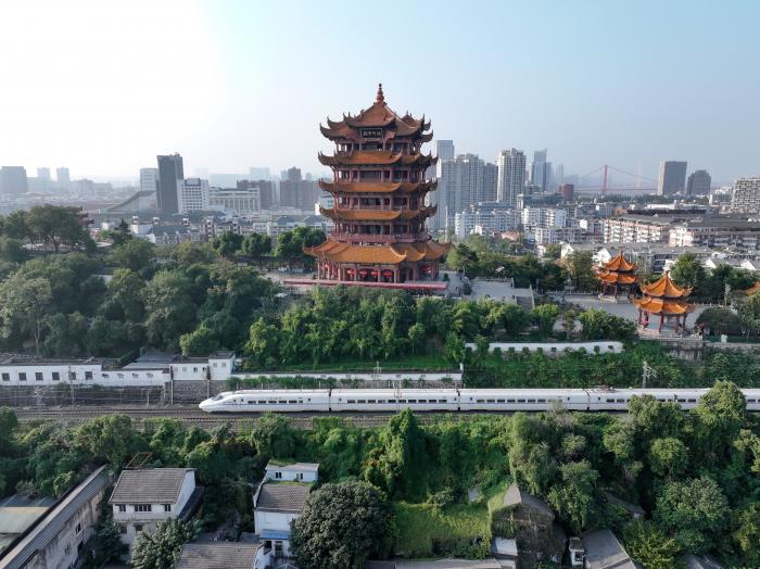 10月10日,动车组列车经过湖北省武汉市黄鹤楼(无人机照片)。新华社发(赵军摄)