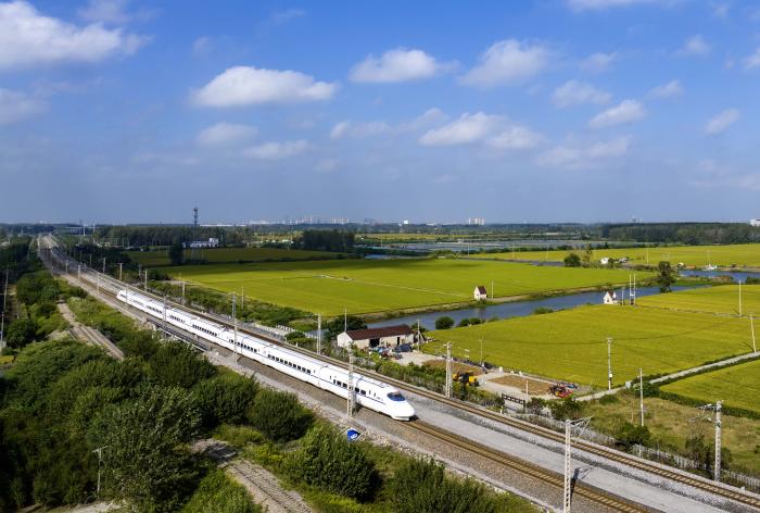 10月10日,列车在宁启铁路江苏省泰州市海陵区境内行驶(无人机照片)。新华社发(汤德宏摄)