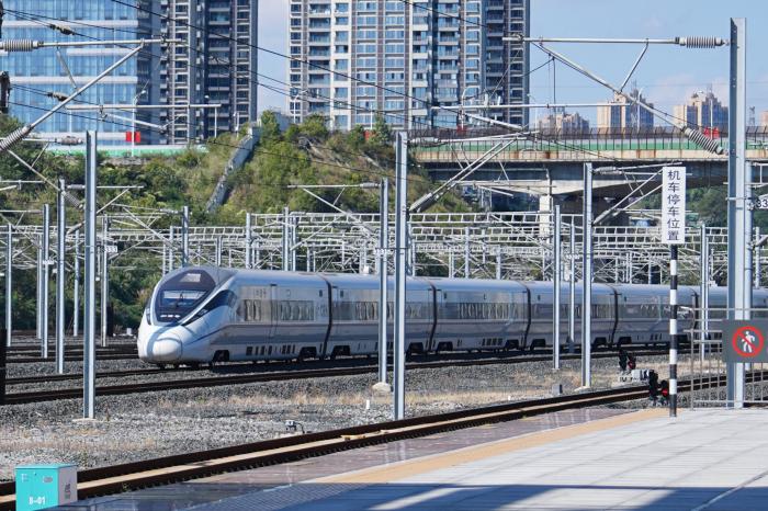 10月10日,一辆列车驶离贵阳北站。新华社发(张维摄)