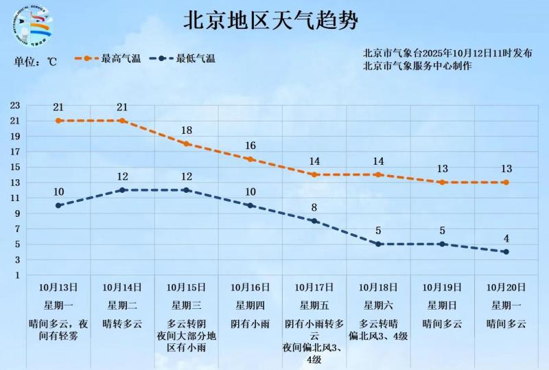 10月13日至10月20日白天最高气温13~21℃,夜间最低气温4~12℃。