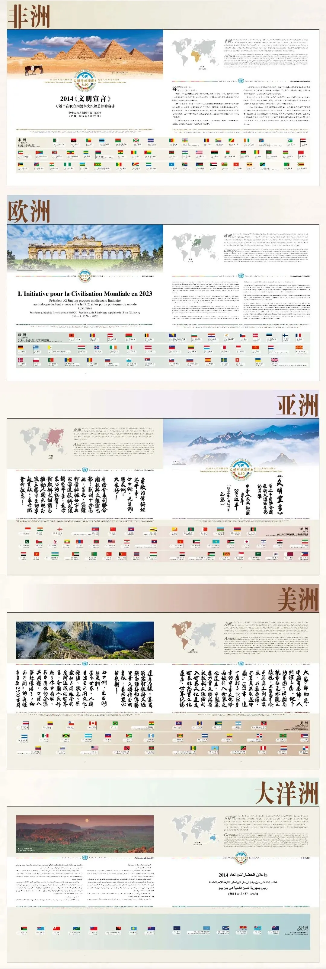 《文明长卷Ⅰ》以习近平主席的2014《文明宣言》(首次提出“文明交流互鉴是推动人类文明进步和世界和平发展的重要动力”)”和2023《全球文明倡议》(倡导尊重文明多样性、弘扬全人类共同价值)为核心文本,以联合国六种官方语言(阿、中、英、法、俄、西)及中国书法艺术呈现。这一设计将中国人的全球文明观,通过国际化的语言表达和富有中国特色的艺术形式向全球展示,为宣介传播习近平文化思想和践行《全球文明倡议》的创新载体《文明长卷Ⅰ》国际传播奠定了坚实的思想根基,体现了中国在全球文明交流互鉴中的积极引领作用。
