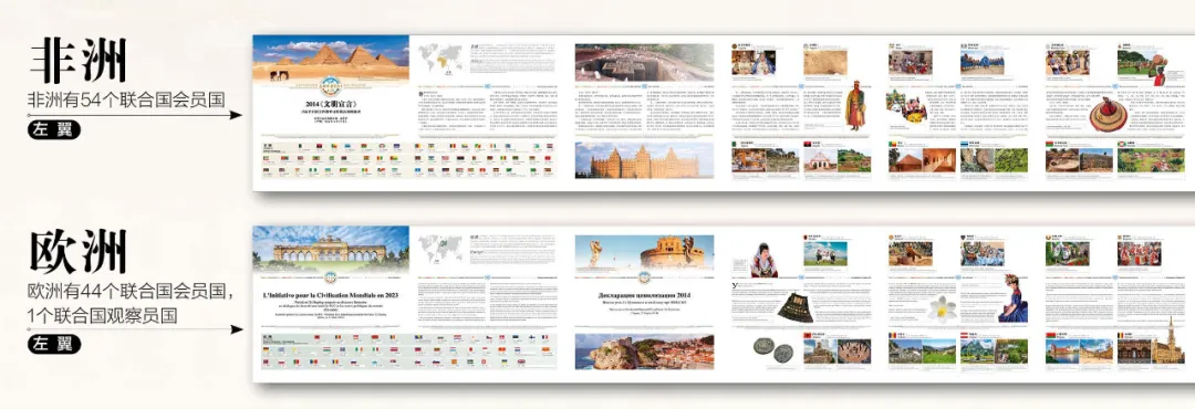 ● 上部/下部:展示世界各国文明标识,呈现“全人类共同价值”的丰富多样性。通过展示各国丰富多样的文明标识性成果,体现了世界文明的多元性,每个国家的文明标识都是其独特历史和文化的结晶,它们共同构成了人类文明的宝库。● 中部(中轴):以多语种对照的形式承载习近平关于文明交流互鉴的论述,形成象征文明对话巨大而紧密的纽带。这一设计将中国人关于全球文明观的重要论述置于《文明长卷Ⅰ》的核心位置,强调其在促进文明对话中的关键作用和枢纽功能,而用联合国六种官方语言对照的形式也方便了世界各地不同语言背景的人们进行理解和交流。