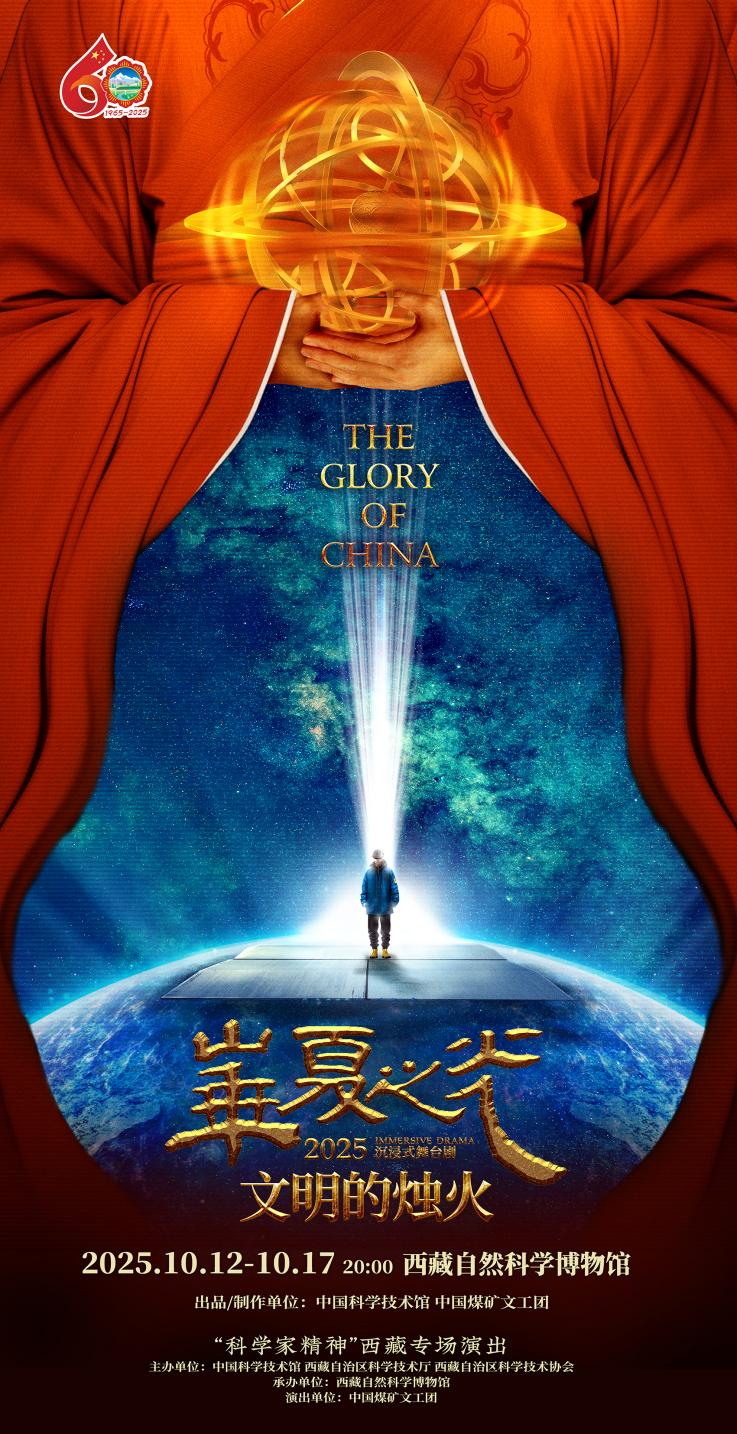 为庆祝西藏自治区成立60周年,由中国科技馆与中国煤矿文工团联合出品的原创沉浸式舞台剧《华夏之光-文明的烛火》走进西藏自然科学博物馆,于10月12日至17日举行公益演出。作为该剧2025年全国巡演的收官之站,演出将以“科学+艺术+文化”的融合形式,为西藏各族群众呈现一场贯通古今、连接中西的科学文化盛宴。