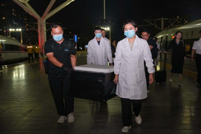9月10日,在长沙子弹库战国帛书从北京运抵长沙南站后,工作人员搬运装有长沙子弹库战国帛书的箱子。新华社记者 薛宇舸 摄