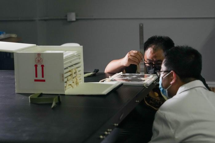 9月11日,工作人员在湖南省博物馆文物库房内准备对长沙子弹库战国帛书进行标准化影像采集。新华社记者 薛宇舸 摄