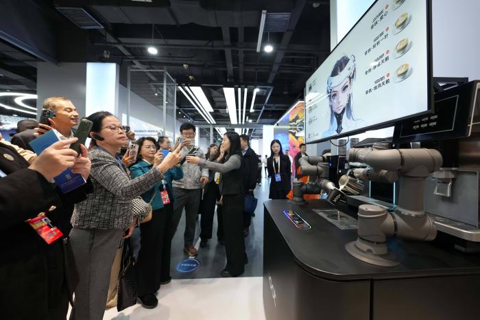 10月14日,嘉宾在北京经开区机器人大世界观看咖啡机器人演示。新华社记者 薛宇舸 摄