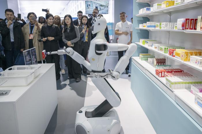 10月14日,嘉宾在北京经开区机器人大世界观看机器人拿取药品。新华社记者 杜子璇 摄