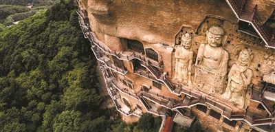 在甘肃天水市东南部的小陇山林海之中,一座孤峰拔地而起,因其形状酷似农家麦垛,故得名“麦积山”。“悬崖千重梯,洞窟如蜂房”,在麦积山的崖壁上,雕凿着221座洞窟,现存造像3938件,壁画1000余平方米,距今已有1600多年的历史。不同时代的石窟艺术瑰宝,在这里一览无余,麦积山石窟也被称为“东方雕塑陈列馆”。