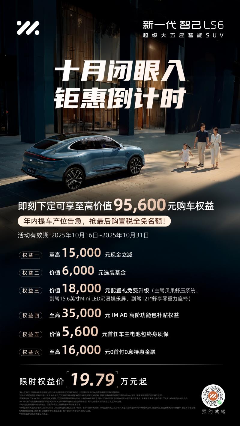 即日起至10月31日,下定新一代智己LS6可尊享至高价值95,600元的购车礼遇,不仅包含用车无忧的首任车主 “电池终身质保”,更有 “IM AD 全功能包”权益等多重惊喜!现在下单,优先锁定爱车,早定早享受,抢产能抢提车,抢最后购置税补贴名额!更多详情,即刻登录IM智己App或小程序,一键拥抱时代最前沿的智能出行体验!
