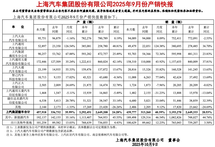 与此同时,自主品牌已经成长为上汽集团业绩的压舱石。9月,上汽旗下自主品牌共销售28.4万辆,以稳定增长构成了集团销量的基本盘。尤其是上汽通用五菱9月销量15.8万辆,同比增长高达43.9%,前9个月累计销量已经突破百万,是上汽集团绝对的销量核心。